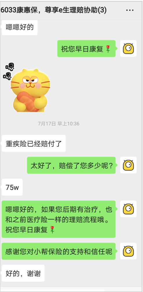 2020年5月,王女士被确诊为甲状腺癌。在家人的陪伴下,王女士办理了住院治疗手续,并将情况告知了她在小帮的专属保险规划师。为了让王女士能够安心治疗,小帮保险规划师和协赔专员第一时间把理赔流程和所需材料清单发送给她,并叮嘱有任何问题都可以第一时间联系小帮。