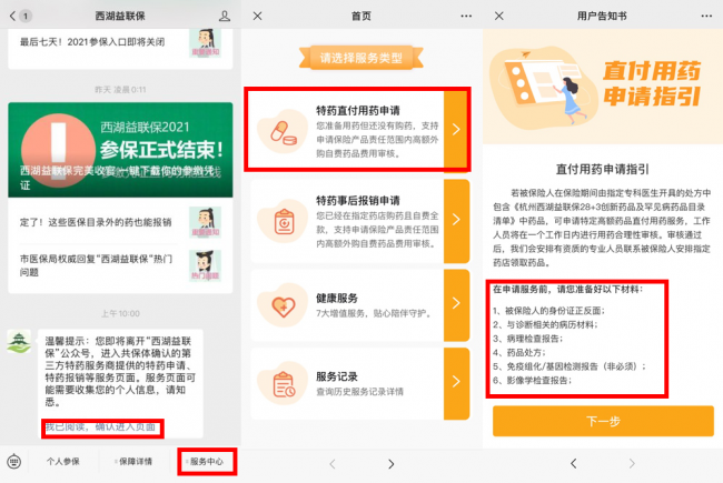 微信端用户可以在【西湖益联保】公众号菜单栏中,点选“服务中心”- “特药服务”,支付宝端用户在“我的保单”中查看【西湖益联保】发起“我要理赔”,选择“肿瘤用药”填写申请,两个渠道均可进入特药理赔界面,根据提示一步步上传资料,等待审核通过即可药房取药。