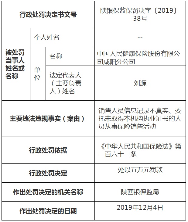 除了前述因“保险条款、保险费率”相关问题被处罚的保险机构,中国人保(601319,股吧)健康还因销售人员信息记录不真实、委托未取得本机构执业证书的人员从事保险销售活动而被处罚5万元,责任人穆玉龙被警告并罚款1万元,作出处罚决定日期为12月4日。