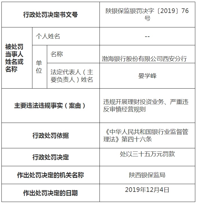 根据陕西银保监局公布的行政处罚信息公开表,依据《中华人民共和国银行业监督管理法》第四十六条,陕西银保监局对渤海银行西安分行分别罚款35万元与25万元,合计罚款60万元。